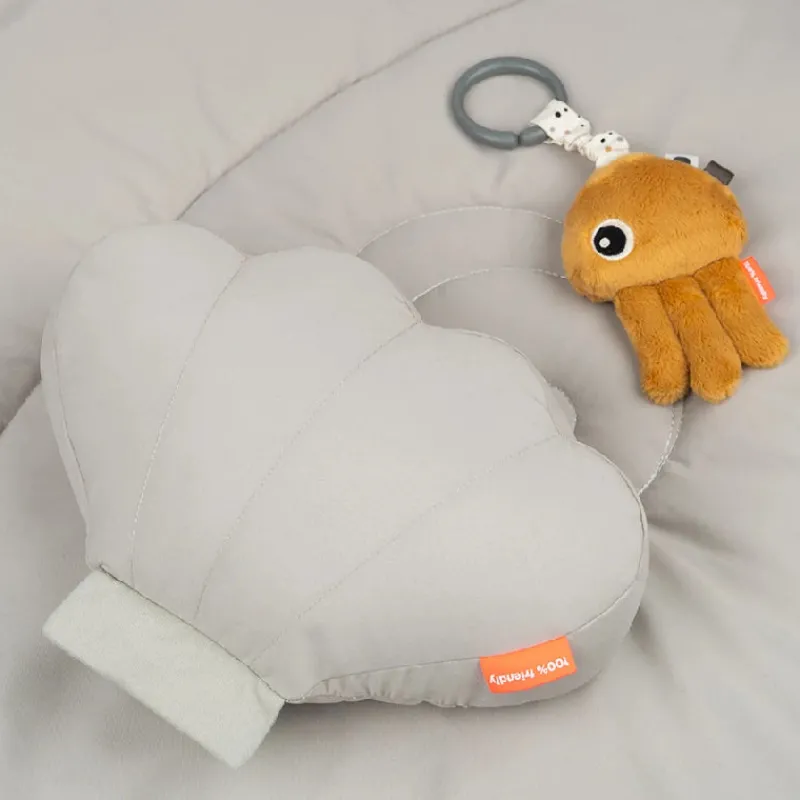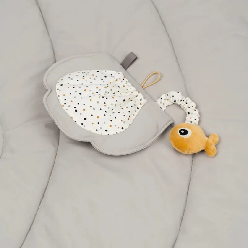 De små kan ligge trygt og godt på den bløde kuglefisk-formede legemåtte og have det sjovt med det søde Sea friends legetøj og de mange stimulerende aktiviteter. På Puffees bløde og bevægelige halefinne kan de finde ekstra støtte når de ligger på maven. Opdag Jellys knitrende lyd, hør Wallys søde klokke og find den lille fisk, der gemmer sig under Puffees finne. Hav det sjovt med at udforske eget spejlbilledet i søstjernens spejl. Flyt let aktivitetslegetøj og spejle rundt på buerne. Et legetøj, der forbliver interessant, både når baby udforsker legetøjet der hænger og når baby ligger på maven og senere sidder op for at lege gemmeleg med den søde fisk. Det stilfulde babyaktivitetscenter er i neutrale tone af grå og mustard.