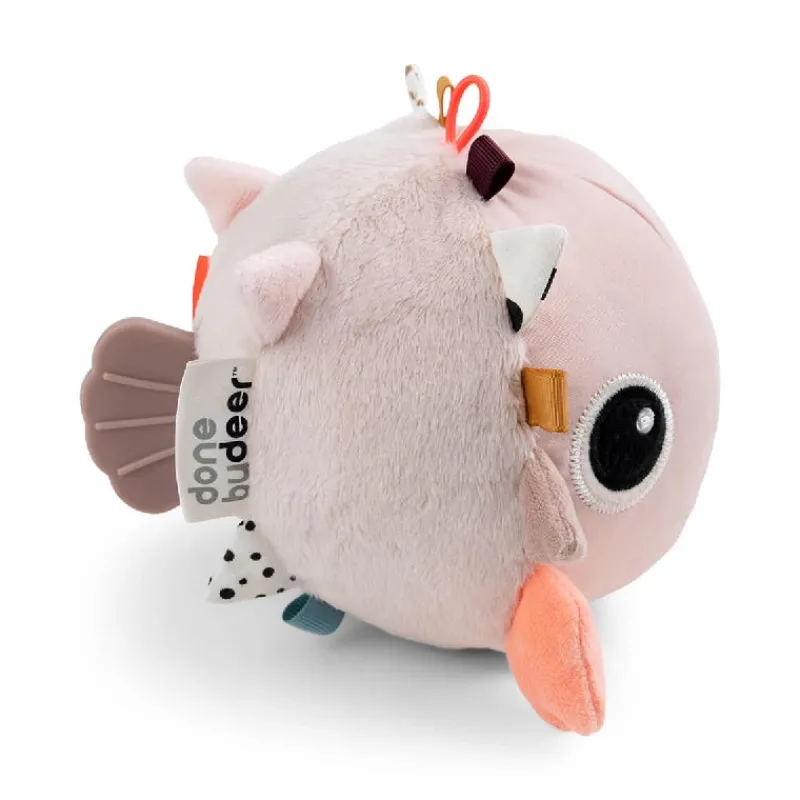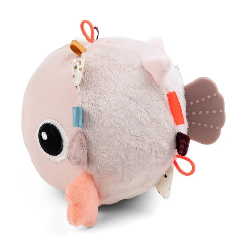 Puffee aktivitetsbolden inviterer nysgerrige øjne og små fingre til at udforske de mange sensoriske funktioner. Hold fast i Puffees bløde pigge og finner og lyt til de spændende knitrelyde. Mærk de forskellige strukturer, og udforsk de farverige mærker. Puffees runde form er perfekt til rul. Puf til den og hør den spændende lyd, der opfordrer de små til at kravle efter den. Silikone bideringen, formet som Puffees halefinne, har forskellige strukturer til at stimulere og berolige gummer som klør. Den skøre kuglefisk er i et mix af pudder og koral rød og har mange funktioner, der stimulerer fin- og grovmotorikken. Elastikken gør det let at fastgøre den til en legemåtte, klapvogn eller aktivitetscenter ved hjælp af en legetøjsring.