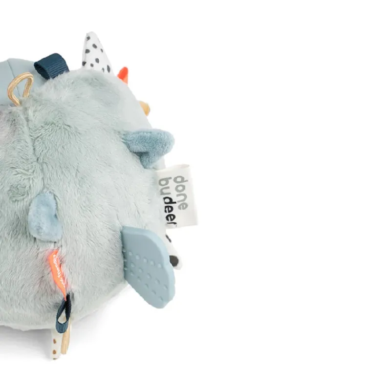 Lad nysgerrige øjne og små fingre gå på opdagelse i Puffee-aktivitetsboldens mange sensoriske detaljer. Hold fast i Puffees bløde pigge og finner og lyt til de spændende knitrelyde. Mærk de forskellige strukturer, og udforsk de farverige mærker. Puffees runde form er perfekt til rul. Puf til den og hør den spændende lyd, der opfordrer de små til at kravle efter den. Silikone bideringen, formet som Puffees halefinne, har forskellige strukturer til at stimulere og berolige gummer som klør. Den kugleskøre kuglefisk er et mix af blå, pudder og mustard farver og har mange funktioner, der stimulerer fin- og grovmotorikken. Elastikken gør det let at fastgøre den til en legemåtte, klapvogn eller aktivitetscenter ved hjælp af en legetøjsring.