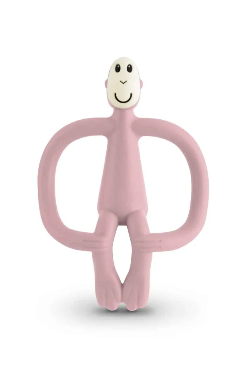 Matchstick Monkey Bidering – Dusty Pink. Sød lille bidering af blød silikone med ergonomisk design, så de små fingre nemt kan få fat i- og holde ved den. Bideringen er blød mod babys ømme gummer, når tænderne finder vej ud. Abens baghoved er designet med små bløde knopper, som kan afhjælpe kløe på gummerne. Den kan puttes i fryseren, så den er kold og dejlig at bide i.