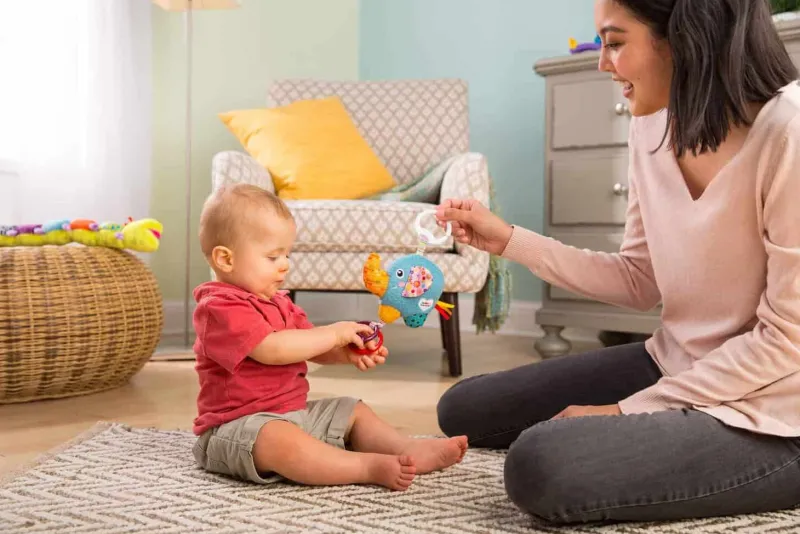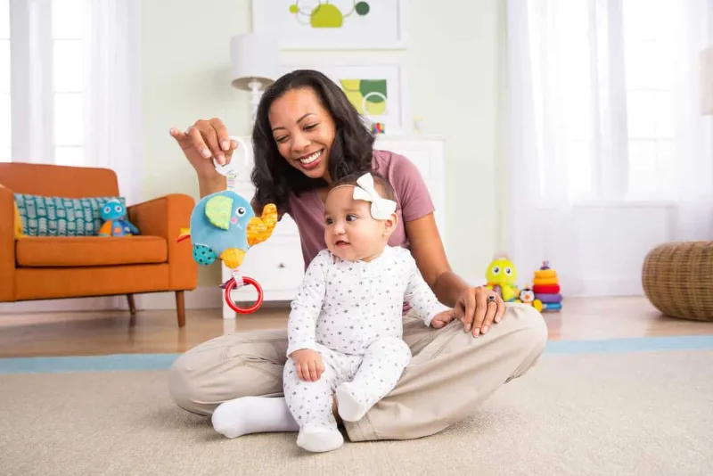 farverige og kontrastfyldte mønster samt forskellige teksturer der hjælper med at udvikle finmotorik. Utrolig nem at have med på farten med Clip & Go systemet.