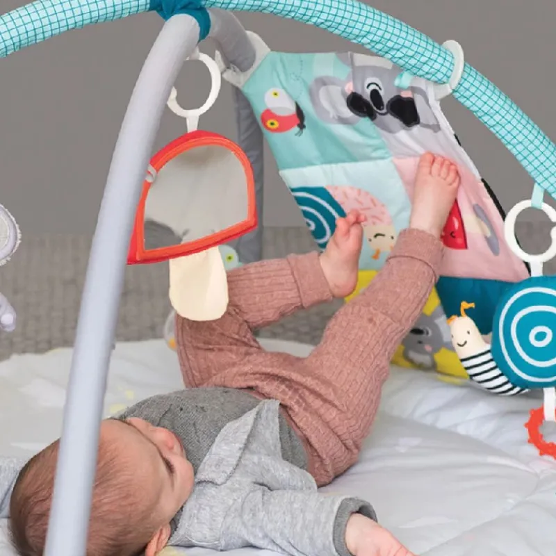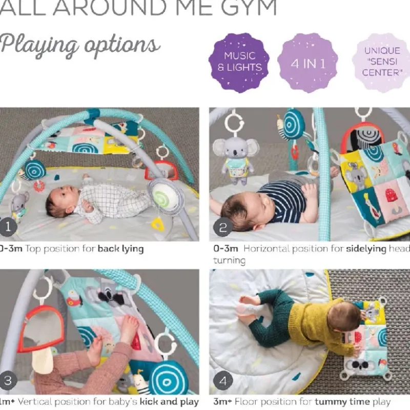 TAF Aktivitetstæppe er i friske farver og indeholder seks legeaktiveteter fx det unikke, knitrende sanse-center. Sanse-centeret har 4 muligheder for fastgørelse og motiverer babyen til at øve sig i forskellige kropspositioner og til at række og sparke ud. Proaktiv placering er enormt værdifuld for en babys motoriske, kognitive, sensoriske og læringsmæssige udvikling. Forskellige kropsstillinger stimulerer babys hoveddrejning og udvikling, og det dobbeltsidede, knitrende center stimulerer babys syn, udvikler hjernen og lærer baby om årsag og virkning. Fra 0 mdr. Batterier (2xLR03-AAA). inkl