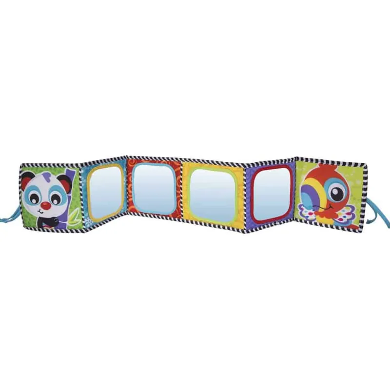 Tummy Time vendbar bog/spejl. Barnevognsrand med 4 spejle på den ene side, og farverige dyr på den anden. Randen kan, ved hjælp af de medfølgende clips, stå frit, så barnet kan se sig selv fra flere sider.