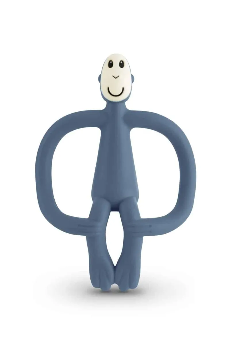 Matchstick Monkey Bidering – Airforce Blue. Sød lille bidering af blød silikone med ergonomisk design, så de små fingre nemt kan få fat i- og holde ved den. Bideringen er blød mod babys ømme gummer, når tænderne finder vej ud. Abens baghoved er designet med små bløde knopper, som kan afhjælpe kløe på gummerne. Den kan puttes i fryseren, så den er kold og dejlig at bide i.