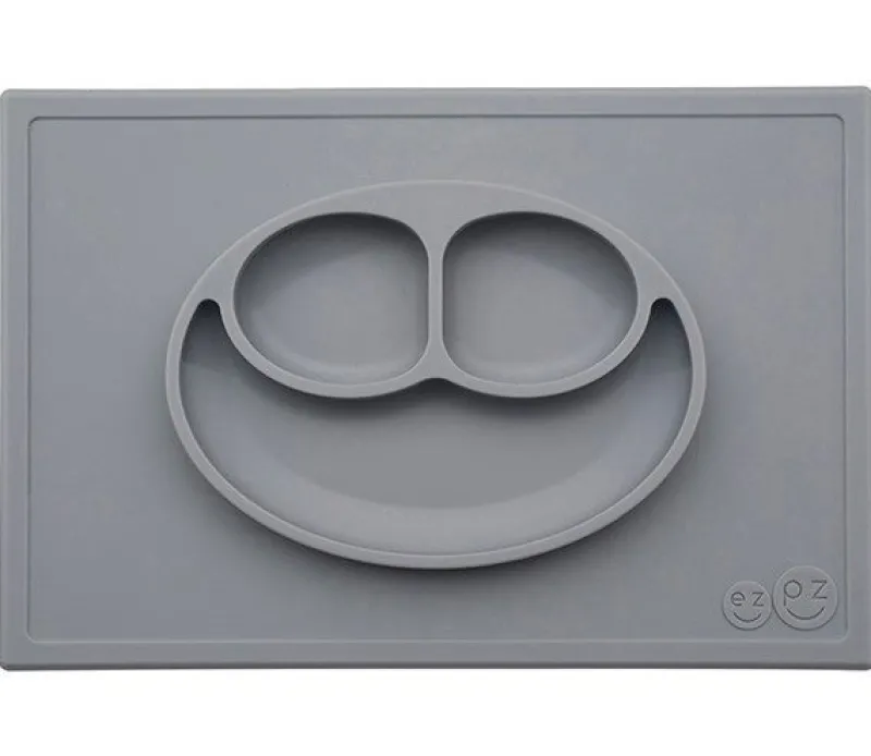Ezpz Happy Mat er en – alt i én – tallerken og dækkeserviet i et. Produceret af højeste EU standard silikone (100%) som er helt fri for BPA, Phthalater, eller PVC. Happy Mat suger sig helt fast til bordet således at barnet ikke kan tippe eller løfte selve tallerknen. Fantastisk at skabe sjove, spændende og dekorative måltider til barnet.