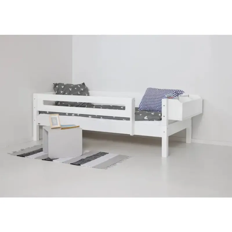 Rigtig god begynderseng – en sikker overgang fra babysengen eller måske fra den lille juniorseng. Her kan barnet sove trygt og godt – “indrammet”, så det ikke falder ud, men samtidig med nem adgang til sengen uden at skulle kravle over sengehesten.