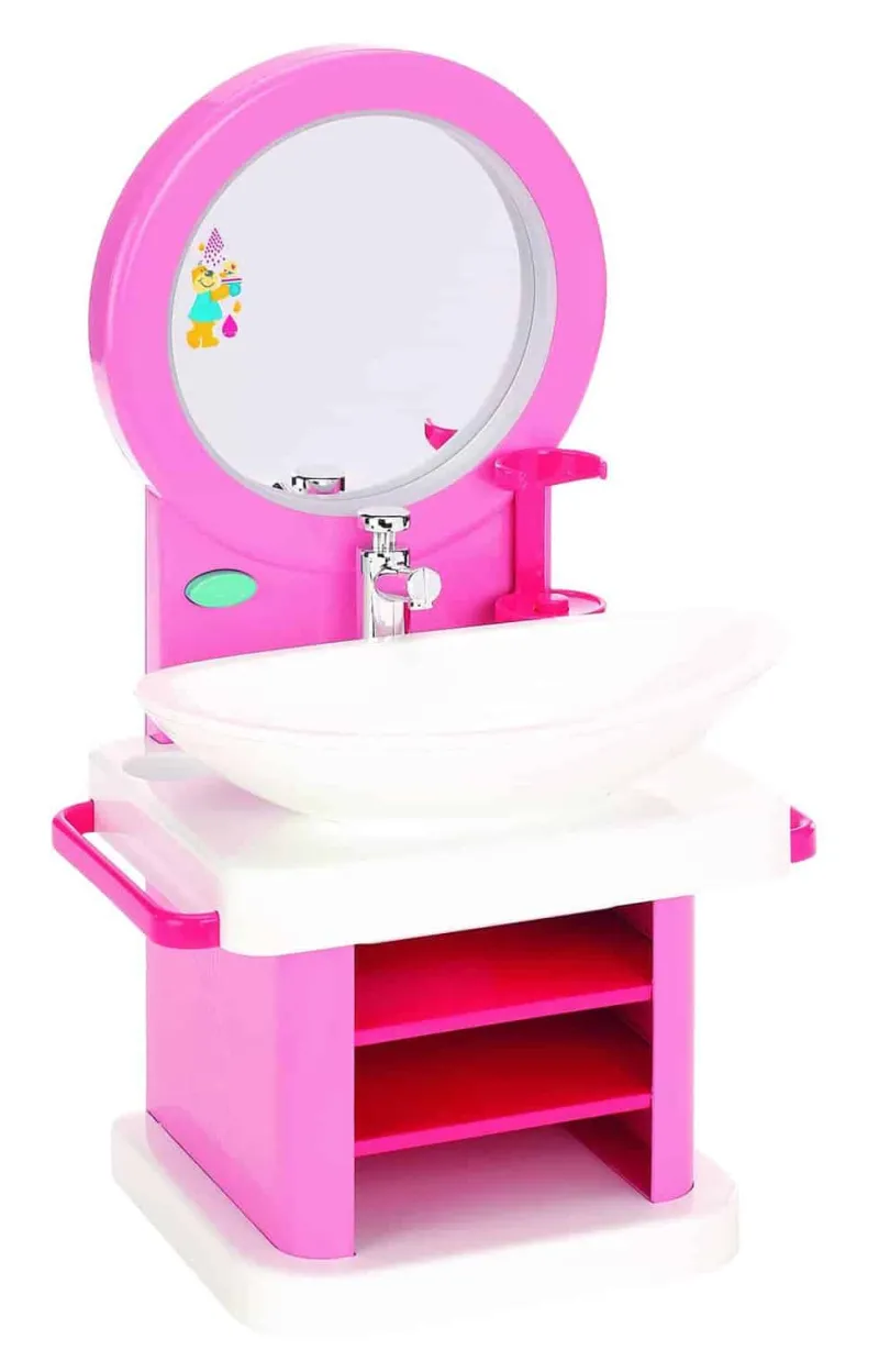 Man skal vaske sine hænder og børste sine tænder… med BABY born badebord er det at holde sig ren en barneleg. Bare put andeproppen i, så du kan fylde vasken ved at trykke på vandhanen et par gange. Spejlet på væggen giver magiske lys- og lydeffekter, mens tandbørsteglasset laver sjove børstetænder-lyde. Alt der mangler, er at tørre hendes ansigt med det lyserøde håndklæde og så kan hun gå tilbage til at lege – måske med gummianden? Premium tilbehør til BABY born dukken. Fra 3 år.