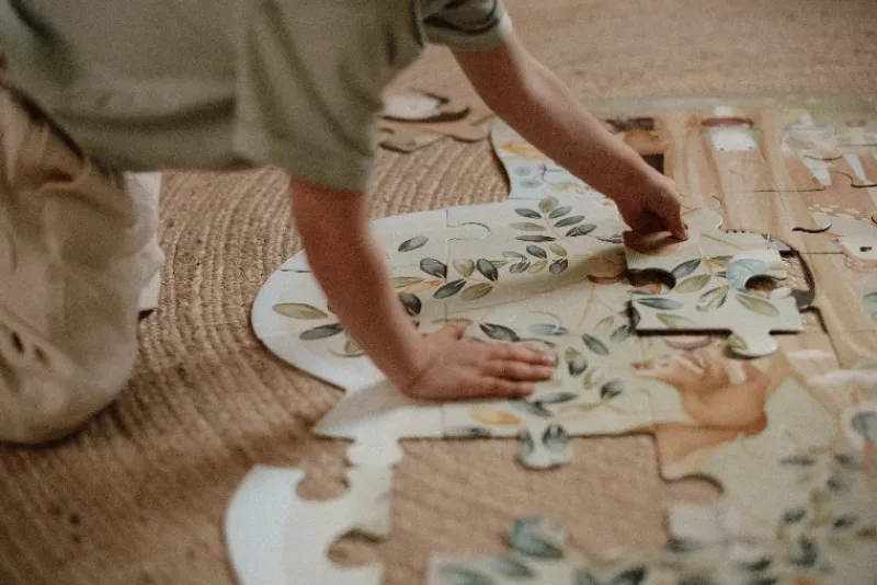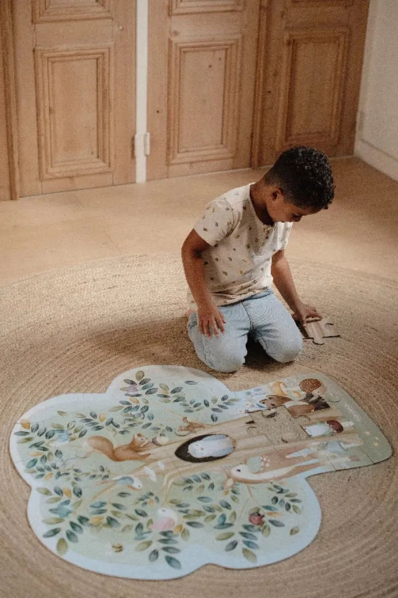 Det store gulvpuslespil skaber glæde og sjov, hver gang det lægges. Puslespillet viser en stor illustration af et træ og de dyr, som gemmer sig i skoven. Kig mellem grenene for at se et egern, der samler agern, fugle, der bygger rede, og insekter, der summer rundt, eller find hvor den venlige ræv gemmer sig? Dette puslespil er ikke bare sjovt – det er en god måde at opbygge koncentration og hånd-øje-koordination på. Så find et hyggeligt sted, og lad skovens magi udfolde sig med 37 brikker.