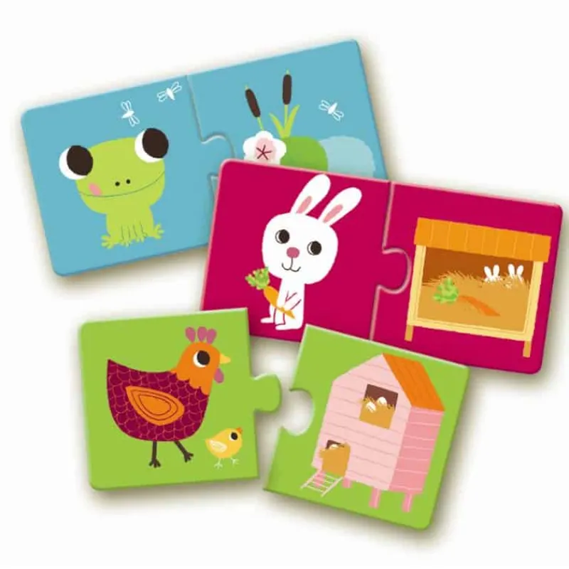 Djeco Lærespil Levesteder. Et flot og lærerigt spil for de mindste. Her skal de finde den rigtige bolig til de 10 forskellige dyr, og sætte disse 2 brikker sammen.