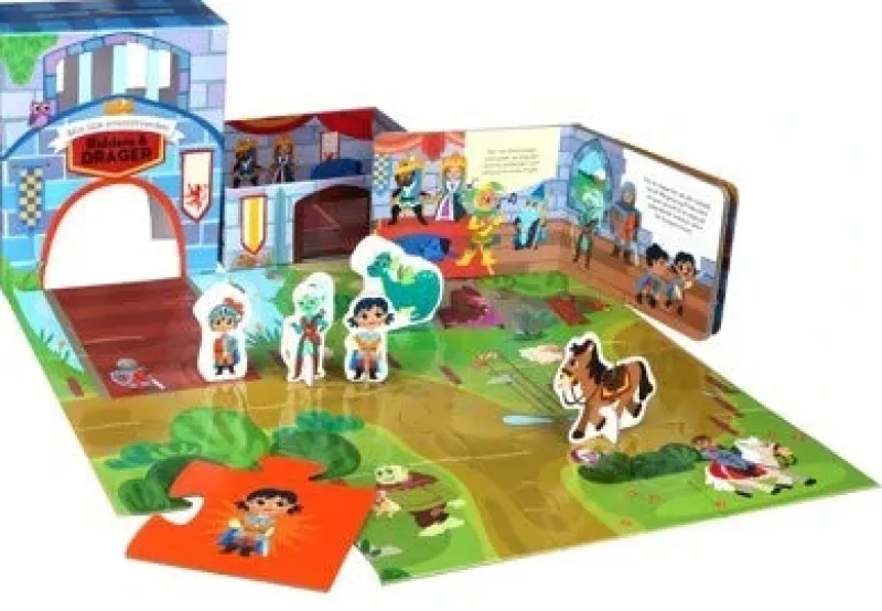 Min lille eventyrverden Junior inviterer børn til fantasifuld og meningsfuld leg, hvor de kan udfolde deres kreativitet og fortælle deres egne historier. Brug den smukke boks, det medfølgende puslespil og de fine træfigurer til at genfortælle eventyr om modige riddere og mystiske drager. Gå på nye, spændende oplevelser i det lille rige og lad fantasien løbe frit. Denne magiske æske indeholder en 16-siders illustreret bog om to modige riddere og en meget genert drage, to træfigurer af høj kvalitet, tre papfigurer, en æske, der kan forvandles til et middelalderslot, samt et puslespil med 16 brikker.