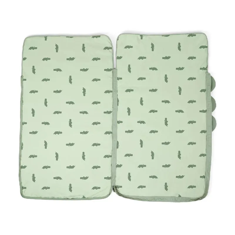 Den quiltede børnesovepose med Croco er perfekt for pyjamasparty. Medbring den hyggelige sovepose til overnatning i en vens hus eller brug den, når dit barn har overnattende gæster. Lyn soveposen op og brug den som et blødt legetæppe for hele familien. Soveposen har et cool Croco print i den bløde jersey foer og 3 krokodilletakker på siden. De to velcro-stropper gør den nem at rulle sammen, og bærehåndtaget er perfekt, når du tager den med på skønne udflugter. Forestil dig at putte med Croco i denne grønne sovepose. Remmene på posen har fine hvide og sandfarvede striber.