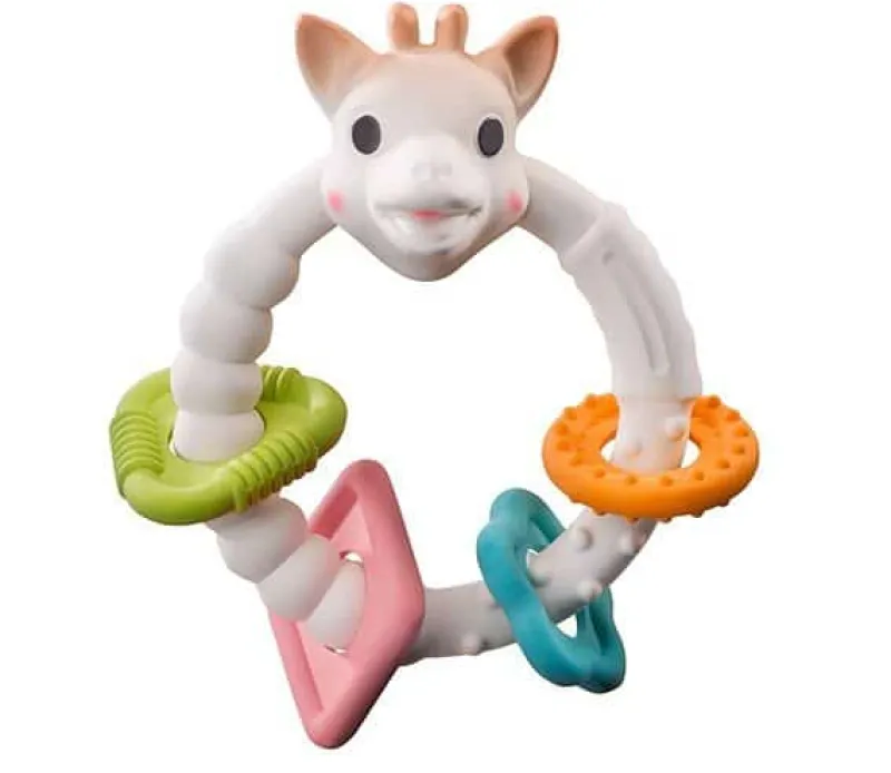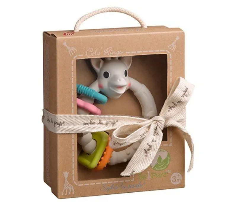 Sophie Giraf So Pure Co’lo Ring. Ranglen er produceret af 100% naturgummi og indfarvet med rene plantefarver. Fyldt med sjove ringe at lege med, og så er den skøn at tygge på – hvilket din barn roligt kan gøre, da ranglen er uden giftige kemikalier.
