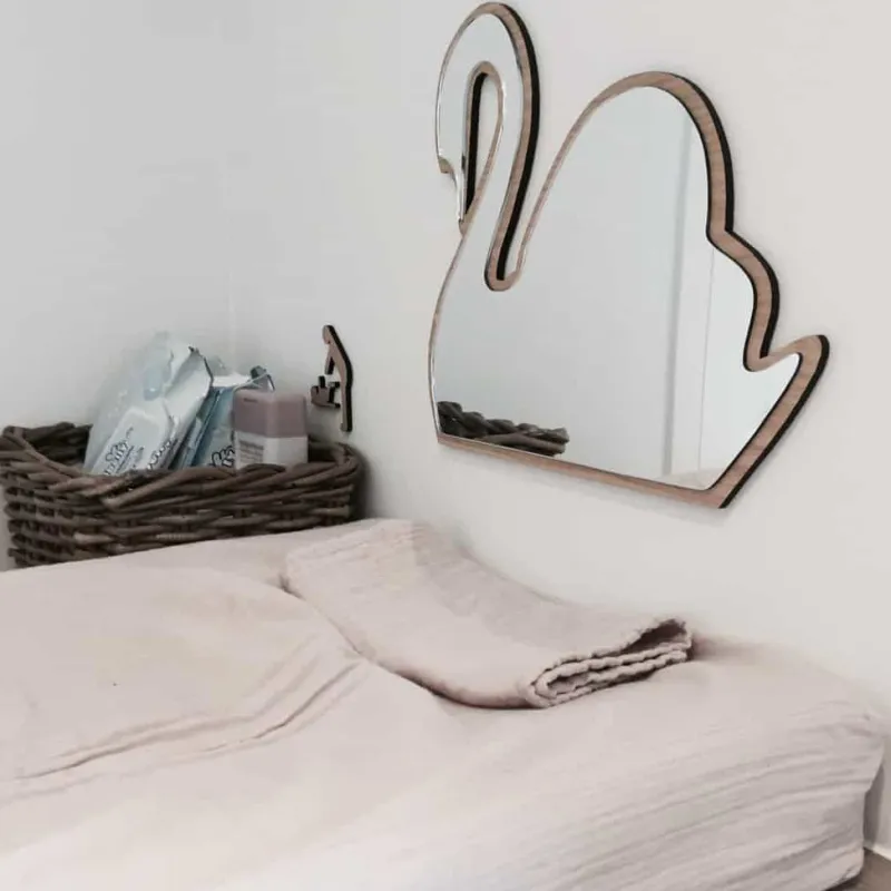 Dette eventyrlige svane børnespejl er lavet af akryl, hvilket vil sige at spejlet ikke har nogle skarpe hjørner og det ikke kan smadre. Det er derfor ekstra velegnet til børneværelset. Brug det ved puslepladsen eller tumlehjørnet hvor babyen skal træne nakke/ryg. Og når barnet er ældre kan det sættes i en højde hvor de kan se sig selv i spejlet eller brug spejlet som pynt på værelset. Mulighederne er mange og du kan rykke rundt på spejlet lige så mange gange du har lyst til.