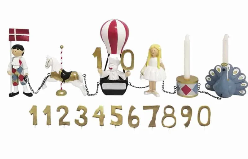Fødselsdagstog med Harlekin og Columbine, flag og 11 tal. Håndmalet.