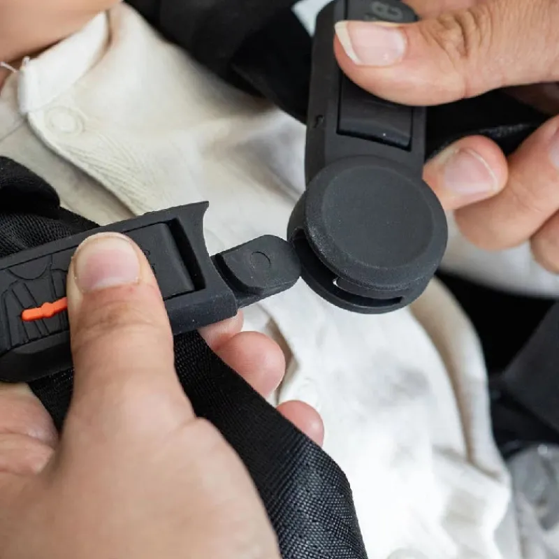 Crash-testet i henhold til UN R129 og opfylder kravene vedrørende størrelse, funktionalitet og nem åbning. Patenteret et-hånds-åbningsmekanisme, der gør det muligt at få barnet hurtigt ud i enhver situation.
