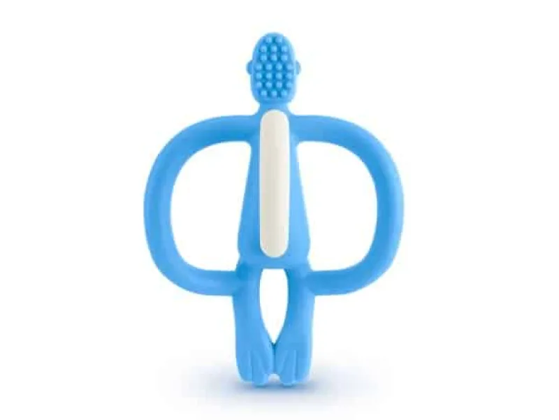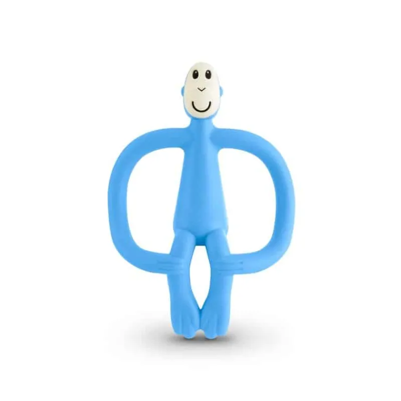 Matchstick Monkey Bidering – Lyseblå. Sød lille bidering af blød silikone med ergonomisk design, så de små fingre nemt kan få fat i- og holde ved den. Bideringen er blød mod babys ømme gummer, når tænderne finder vej ud. Abens baghoved er designet med små bløde knopper, som kan afhjælpe kløe på gummerne. Den kan puttes i fryseren, så den er kold og dejlig at bide i.