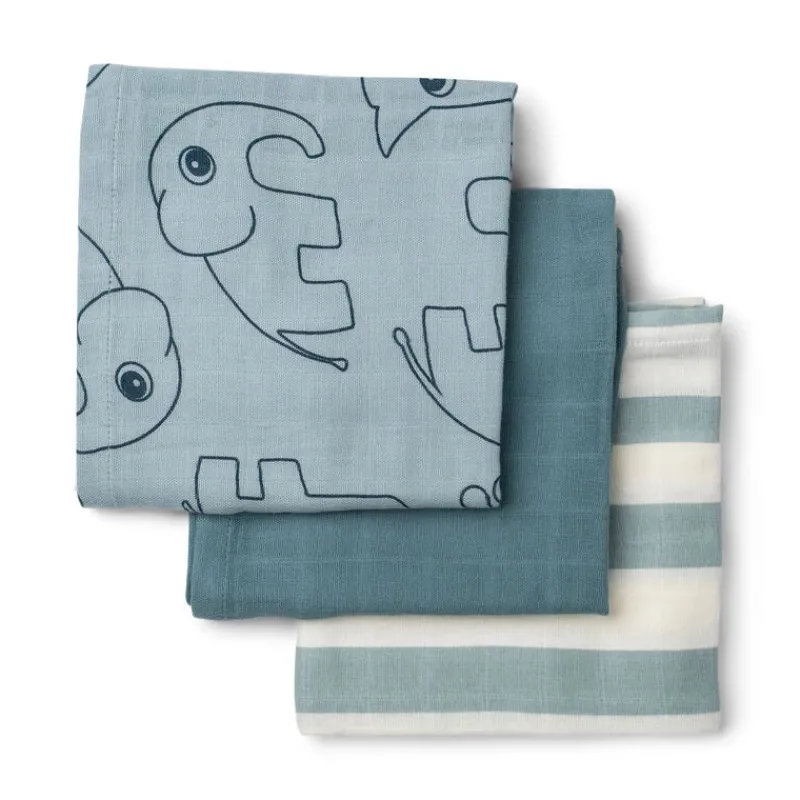 Et sæt med tre bløde stofbleer i økologisk bomuld dekoreret med striber og Deer friends. De to-lags musselin stofbleer er behagelige, åndbare og praktiske. Ved vask bliver de endnu blødere og får et tykkere ‘vaffel’ udtryk. Universal stofbleerne er et baby must-have for enhver ny forælder. De er perfekte når der skal bøvses efter spisning, når de små begynder at spise selv eller som underlag ved bleskift. Det søde sæt af stofbleer i toner af blå er en perfekt gaveidé.