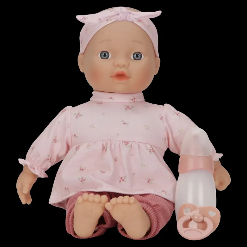 Mød baby Lily. Giv hende et kram og pas på hende. Lily er en yndig og livagtig dukke med en blød og nuttet krop, som elsker at blive elsket. Du kan skifte hendes tøj, hjælpe hende med at falde i søvn og berolige hende med sutten. Når hun er sulten, kan du tilbyde hende mælk af sutteflasken. Børn elsker at efterligne alt, hvad deres forældre gør, og denne babydukke vil inspirere dit barn til at deltage i rollelege om pleje og omsorg. Lily har hårbånd, langærmet kjole og lyserøde bukser med ribkant. At skifte hendes tøj fremmer finmotorikken og sutten og sutteflasken tilføjer et element af interaktiv leg.