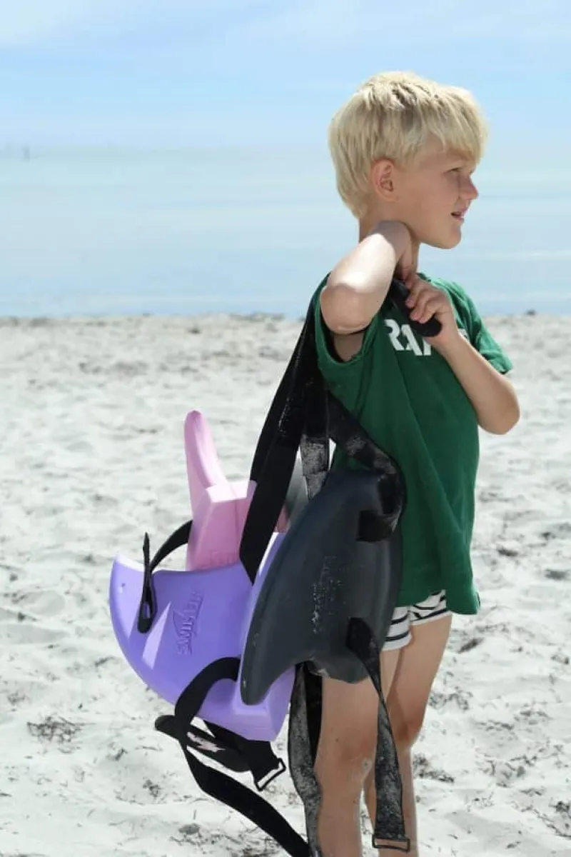 SwimFin Hajfinne – Antracitgrå. Svømmefinnen fra Swimfin spændes på ryggen og er en genial måde at hjælpe barnet til at svømme naturligt på. Finnen er designet til at generere opdrift, og hjælper derved barnet til at holde sig ovenvande – helt uden at hæmme barnets bevægelser og leg.