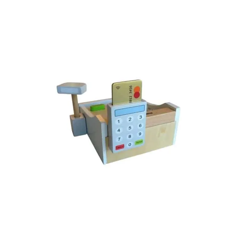 Kasseapparat, betalingskort, scanner og mønter er lavet af træ.