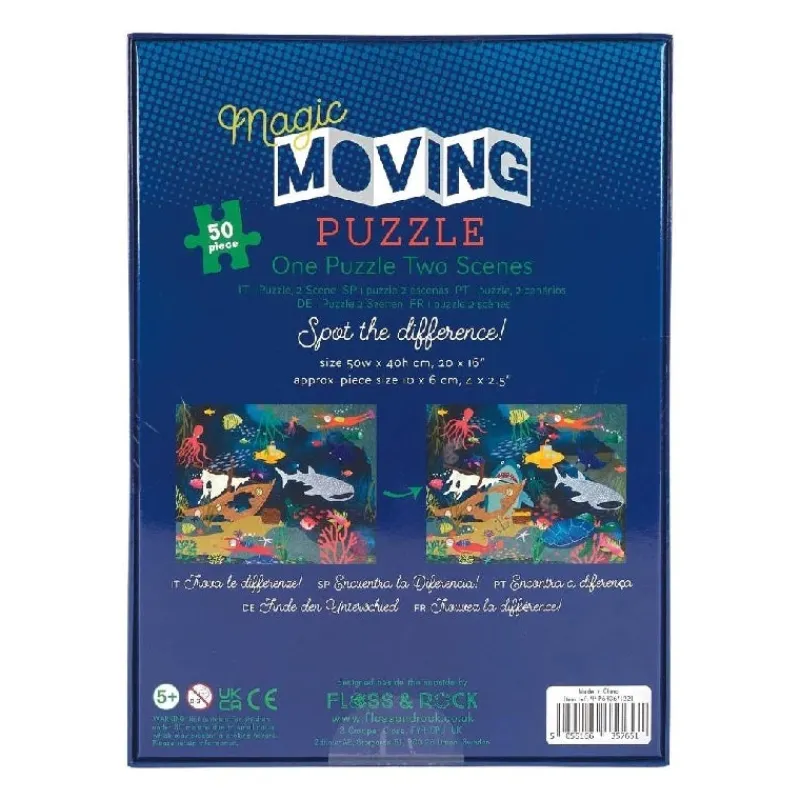 Forbered dig på at blive blæst bagover af vores fantastiske Magic Moving Puslespil! Du vil have så meget sjov med dette speciale puslespil, som giver dig mulighed for at se hajer svømme, dykkere, dykke, blæksprutter flyde og meget mere, der bevæger sig lige foran dine øjne. Fuldfør puslespillet med 50 store, tykke puslespilsbrikker, og når det er færdigt, kan du have det endnu sjovere med at flytte det fra side til side for at få magien til at ske!