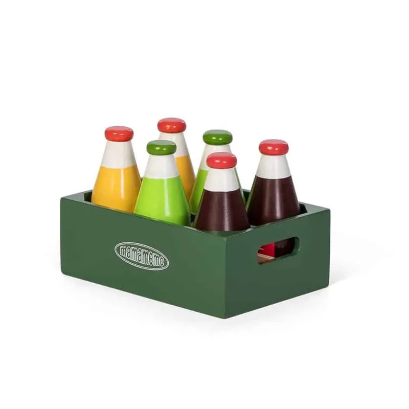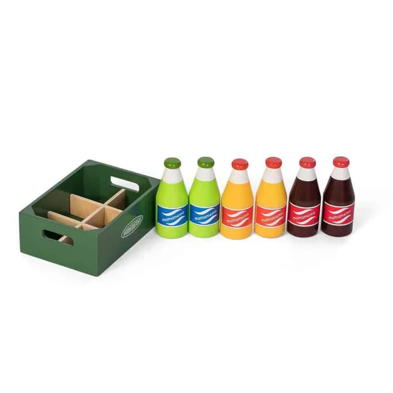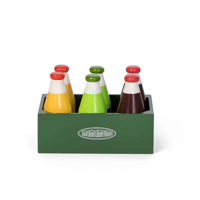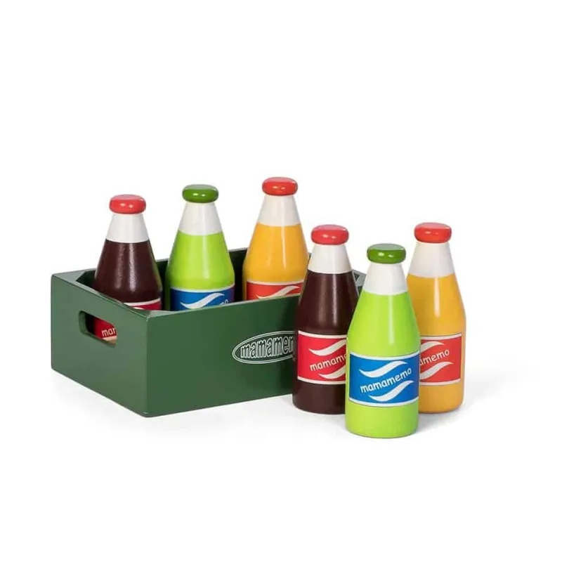 FSC kasse: str.: 16×11 x 5,5 cm Flasker: Ø: 4 cm. H: 10 cm. 2 appelsin / 2 sport / 2 cola 3+