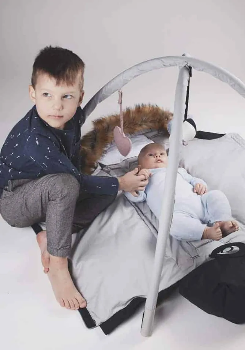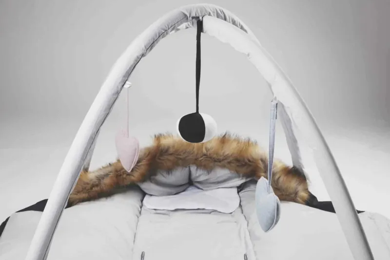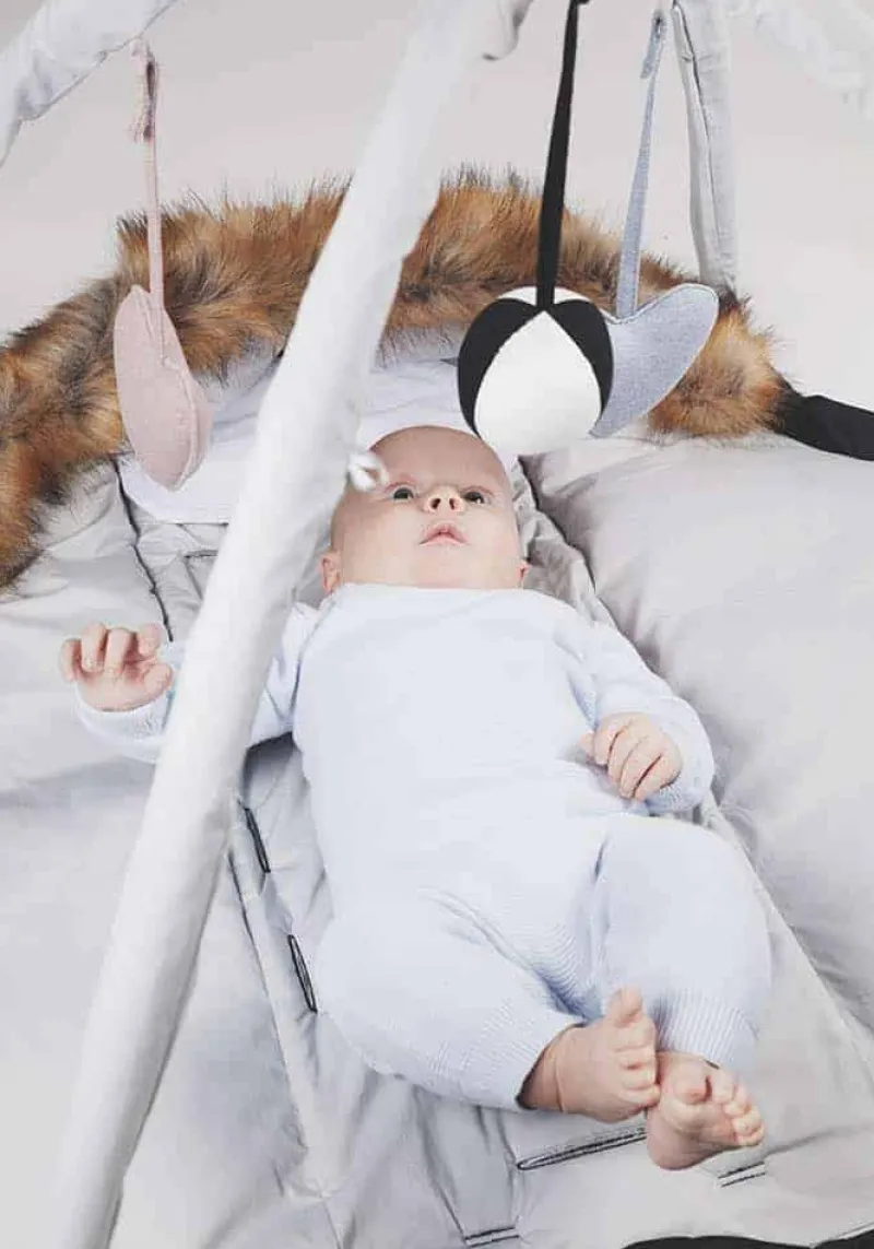 Legetøjsstativ, der passer til Easygrows køreposer, når køreposen foldes ud og bruges som legetæppe. Tilpasset model HOOD, HOOD W, HOOD Norse, Exclusive, NORD og Nature. Til leg og stimulering af barnets sanser og motorik. Leveres med 3 stk. legetøj i blødt stof, der nemt kan sættes på og fjernes igen – bold med klokke og 2 hjerter.