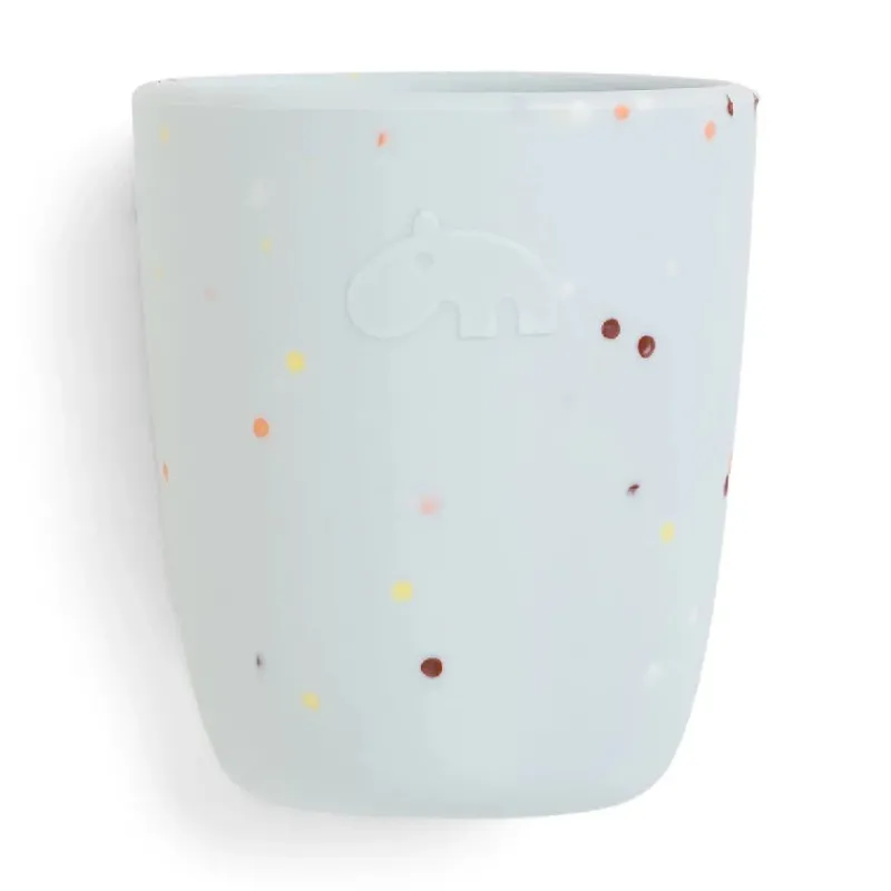 En blå gulerodsskål, et lyseblåt konfetti-krus og en mørkeblå ske gør dette spisesæt til en oplagt gaveidé til små, nye spisere.
