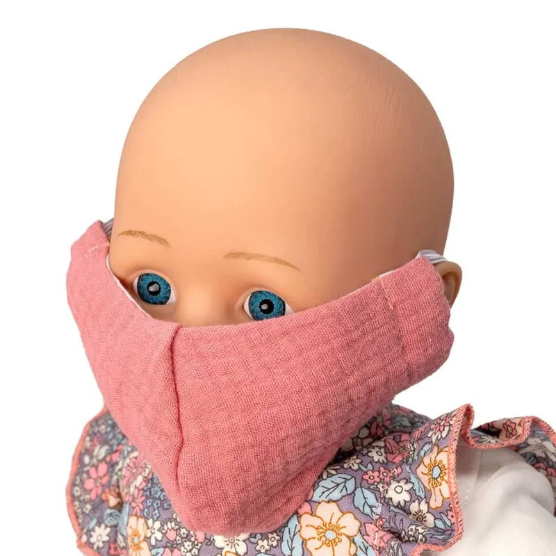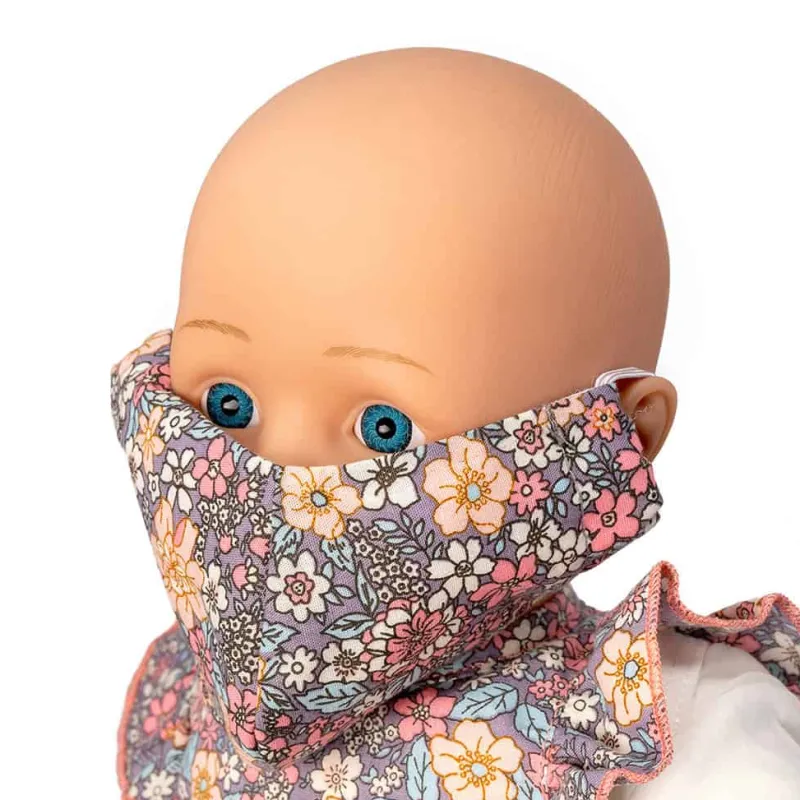 Ønsker man, at dukken eller bamsen skal have lidt mønster på deres legemundbind, så medfølger der et lilla, pink og blomstret.