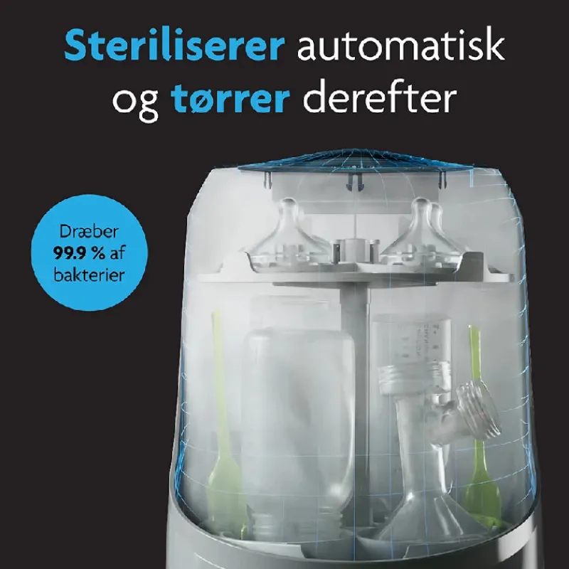 – Automatisk vask, sterilisering og tørring af flasker, brystpumpedele, tudkopper og tilbehør. Brug aldrig en flaskebørste igen!