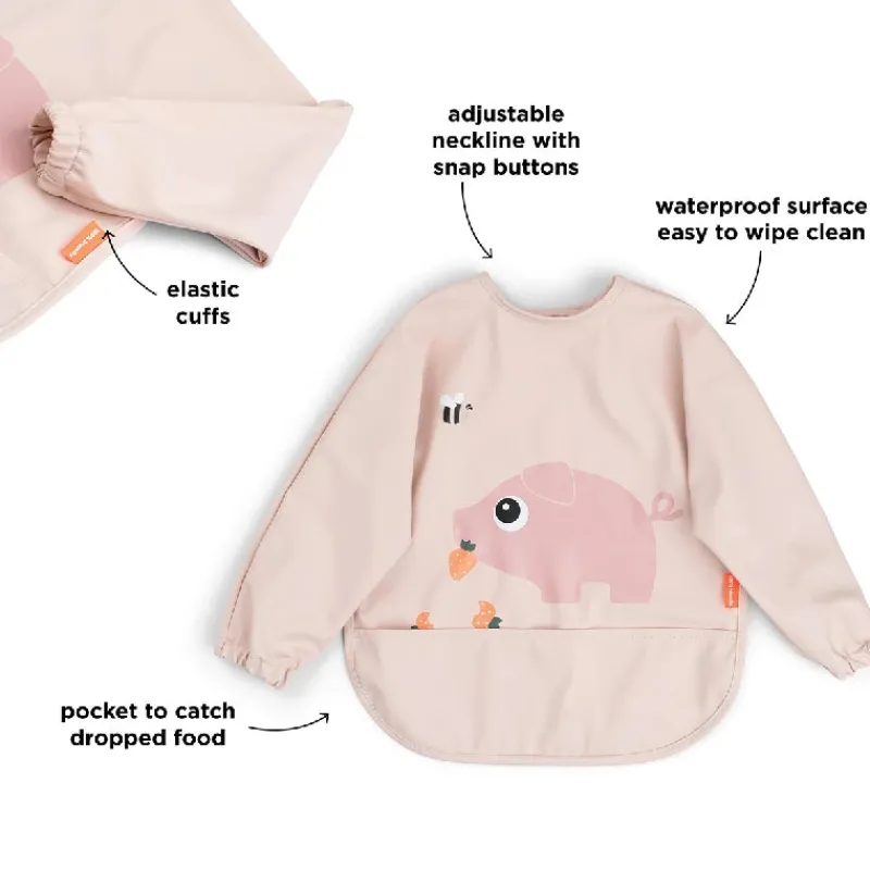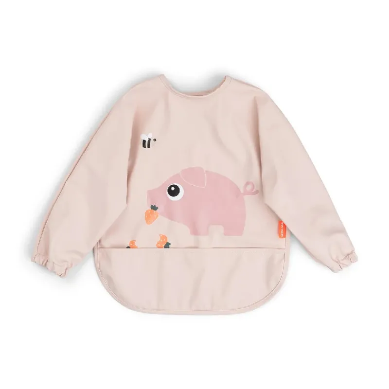 Hagesmæk med ærmer og en lomme til at fange tabt mad