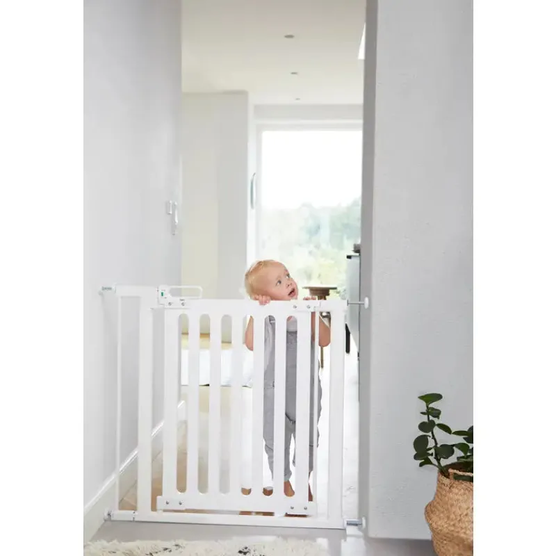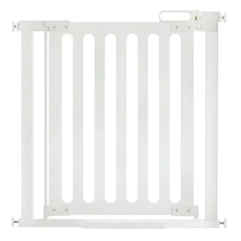 Presmonteret sikkerhedsgitter for børn.Dette sikkerhedsgitter er anvendeligt i alle stærke og ubeskadigede åbninger, dog ikke på toppen af trapper.Gitteret er meget velegnet til døråbninger og passager, der bruges hyppigt.Indbygget indikator til kontrol af korrekt montering og optimal funktion i den daglige anvendelse.Mulighed for at blokere åbning den ene vej.Indbygget tryk-og-løft-funktion for nem betjening. Svært for børn, men enkelt for voksne.Ekstra nattesikkerhed med selvlysende bundvange.