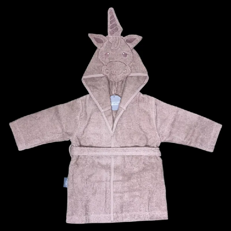 Lækker frotté badekåbe fra Nørgaard Madsen i en flot duset mauve farve m/ enhjørning på hætten str. 4 år. Oeko Tex certificeret bomuld.