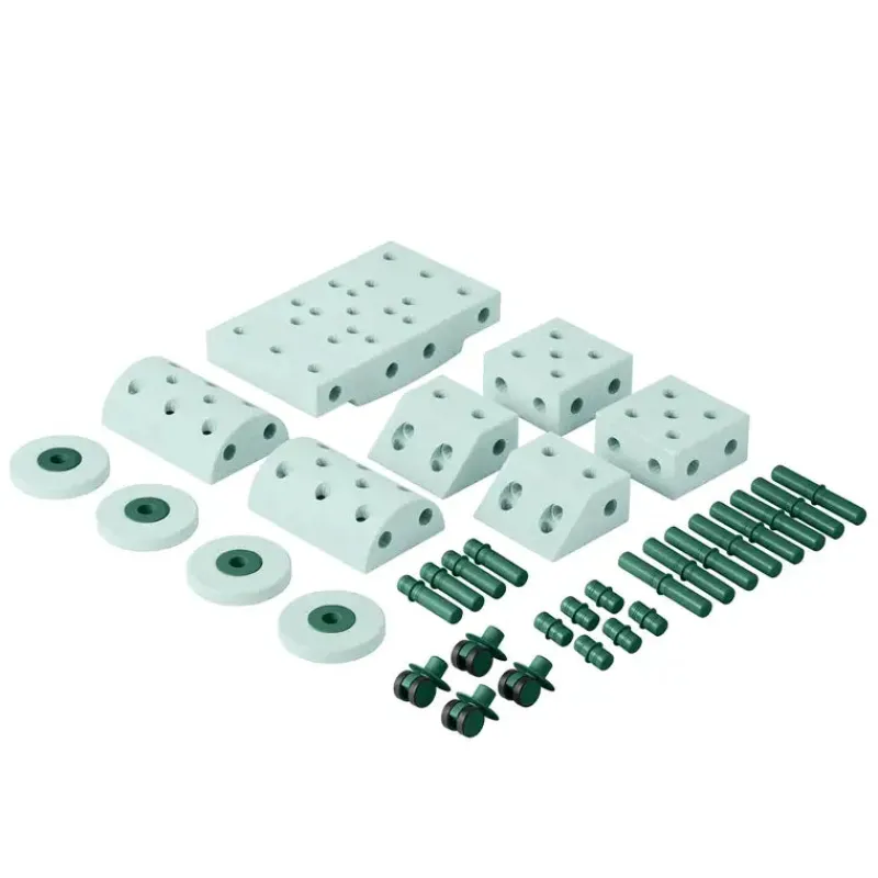 Legetøjet er produceret i børnevenlige materialer af højeste kvalitet, og klodserne er bløde og behagelige at tumle rundt på. Både klodser og løsdele er hårdføre, nemme at rengøre og kan gå i opvaskemaskinen.