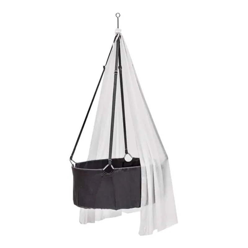 Den fine, lette himmel indrammer Leander Classic™ vuggen og fungerer samtidig som en beskyttende hule for barnet. Himlen fremhæver det æstetiske i vuggen både med og uden stativ.
