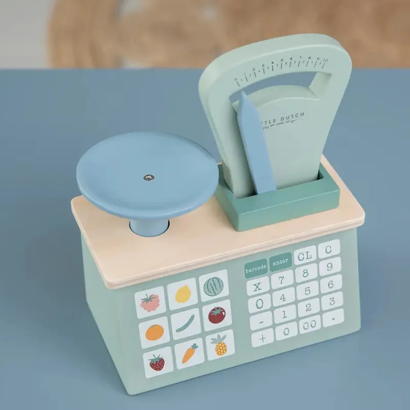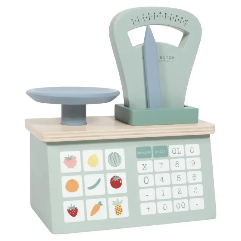 Denne fine Little Dutch vægt i træ findes i en smuk mint farve. Vægten er en must-have til enhvert køkken eller markedsbod.
