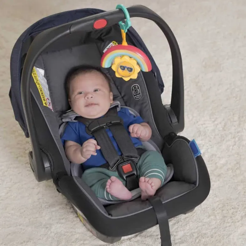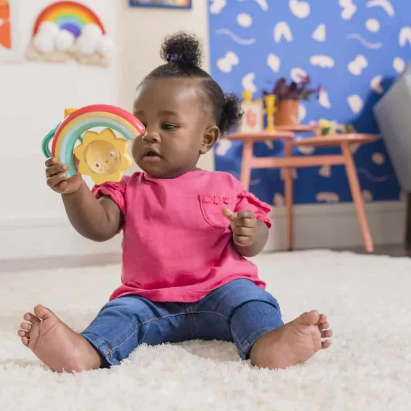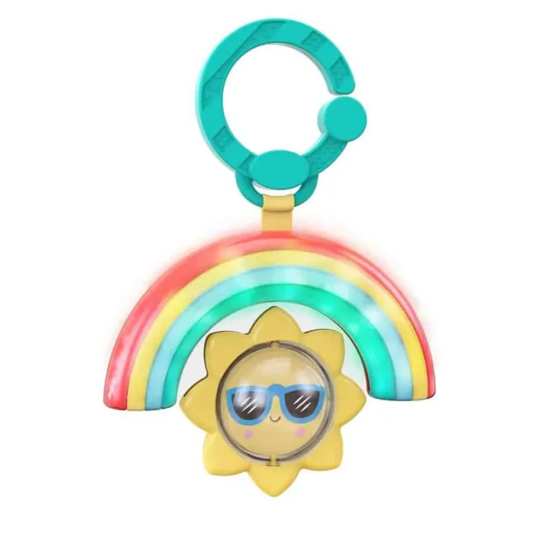 Fang dit barns øje og hold opmærksomheden med Sun Shaker fra Bright Starts! Du vil glæde dit barn med årsag og virkning-overraskelser som den lysende regnbue og muntre melodier. Baby kan selv styre legen ved at aktivere lys og musik med bare en rystebevægelse. Motivér finmotorikken med det roterende solskin, der viser et andet ansigt på hver side! Drej det rundt for at se solen iført virkelig cool solbriller. Tag legetøjet med for mere sjov på turen ved at klikke det fast med vedhænget, der passer til de fleste autostole eller klapvogne.
