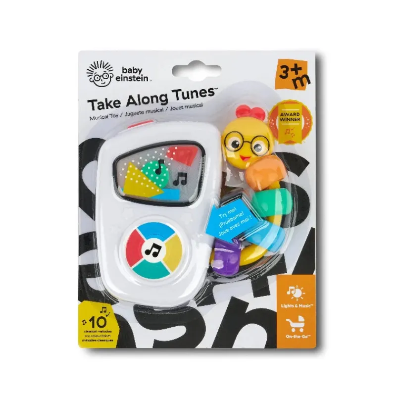 Det prisvindende Baby Einstein Take Along Tunes Musical legetøj er lavet til små maestroer. Dette legetøj er din lille musikers åbningsnummer og vil hurtigt blive en favorit. Det er vigtigt at give din baby legetøj, der spiller musik, for at fremme glæden ved musikken i en ung alder. Med det musikalske legetøj Take Along Tunes kan babyer bruge den store knap til at skifte mellem de genskabte klassiske mesterværker fra Chopin til Mozart og meget mere. Farverige lys danser over skærmen til rytmen af hver melodi og fanger dit barn, mens det opmuntrer til både auditiv og visuel sansning.