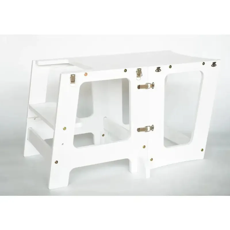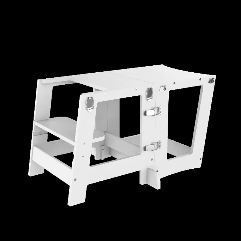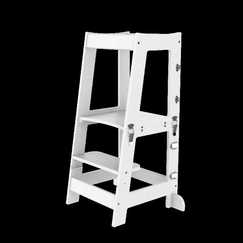Derudover kan det sammenklappelige læringstårn også fungere som bord og stol, da tårnet kan indstilles i flere forskellige højdeniveauer for at matche dit barns udviklingstrin. Tårnet er designet med vores intelligente og innovative klik-system, hvilket gør det nemt at samle, adskille og justere efter dit barns behov.