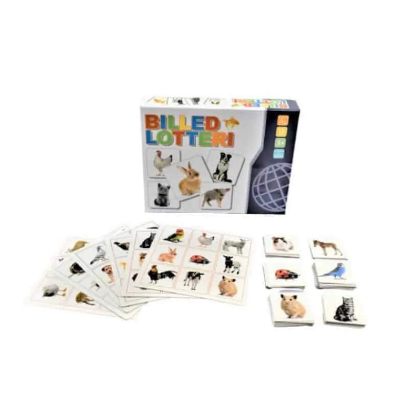 Billedlotteri m/dyr. 6 spilleplader & 54 billedkort. Nemt og hyggeligt familiespil Mål 22x28x5 cm. +3år.