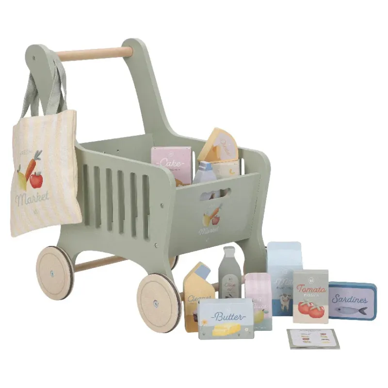 Vognen er dekoreret med en sjov illustration på forsiden, som gør legen endnu sjovere. Vil du have den ultimative indkøbsoplevelse? Kombiner indkøbsvognen med markedsboden, og nyd endeløs indkøbssjov!