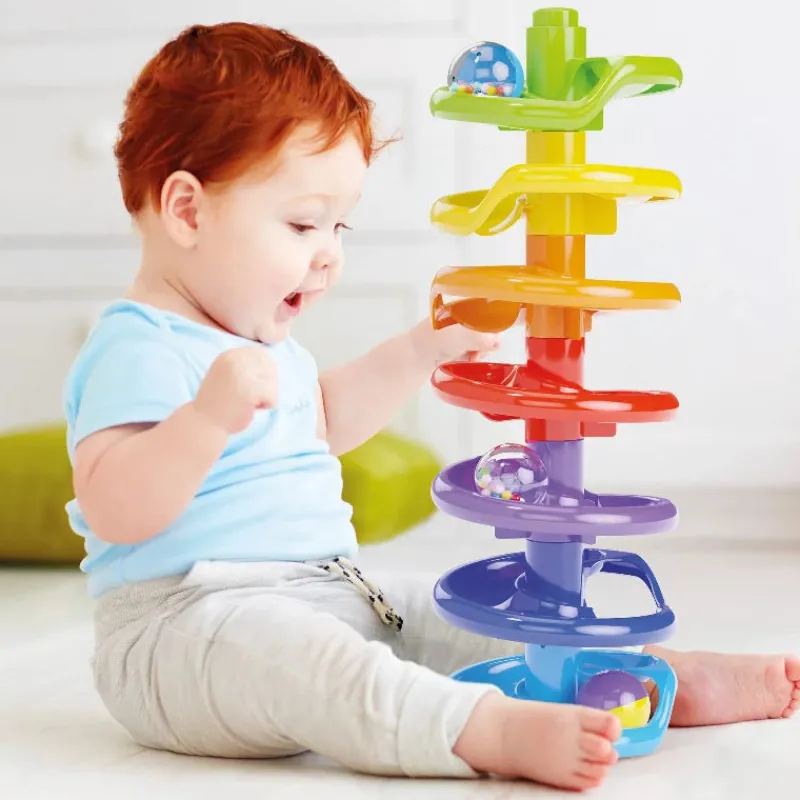 Dette flotte legetøj træner dit barns finmotorik ved at bygge tårnet, gribe om og slippe kuglerne samt forståelsen af årsag og virkning ved at se kuglerne trille ned ad den sjove bane.