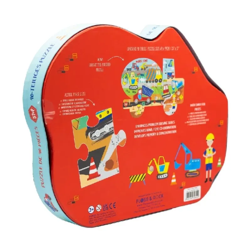 Dit barn vil elske dette super seje puslespil formet som arbejdsbil. Puslespillet er fyldt med gravemaskiner , betonblanderer, folk i hjelm og meget mere! Æsken indeholder 40 dejlige, tykke puslespilsbrikker med skinnende foliedetaljer.