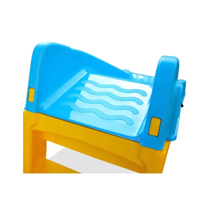 Rutsjebanen er stabilt konstrueret så den ikke tipper og når barnet har taget trinnene op,