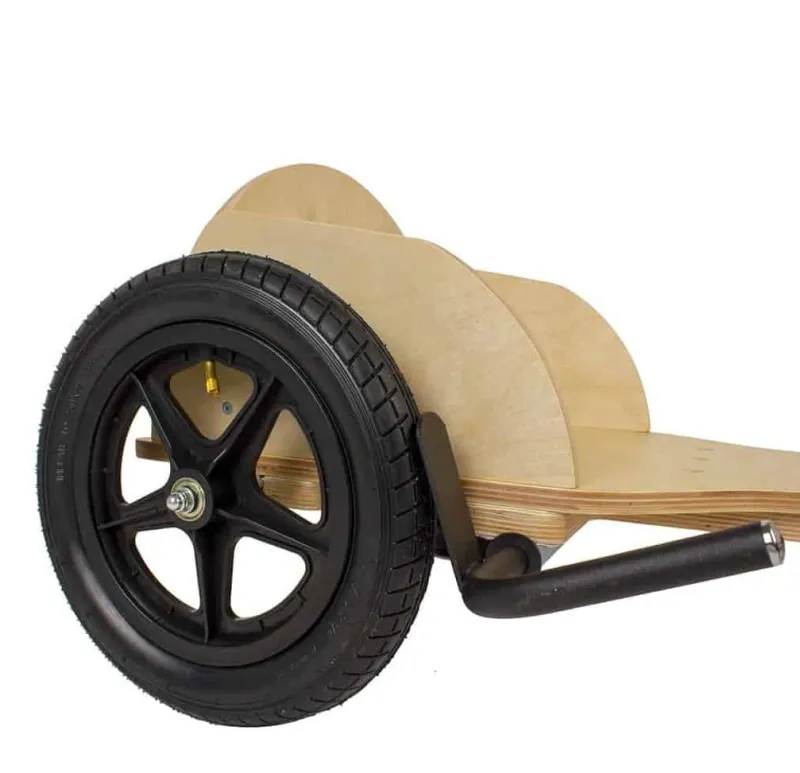 Kvalitetshjul med gode kuglelejer gør køreturen sjovere og behagligere – både for den der kører og skubber, og et kraftigt reb monteret på forakslen gør den nem at styre. Kommer der lidt for meget fart på trækker du bare i håndbremsen.