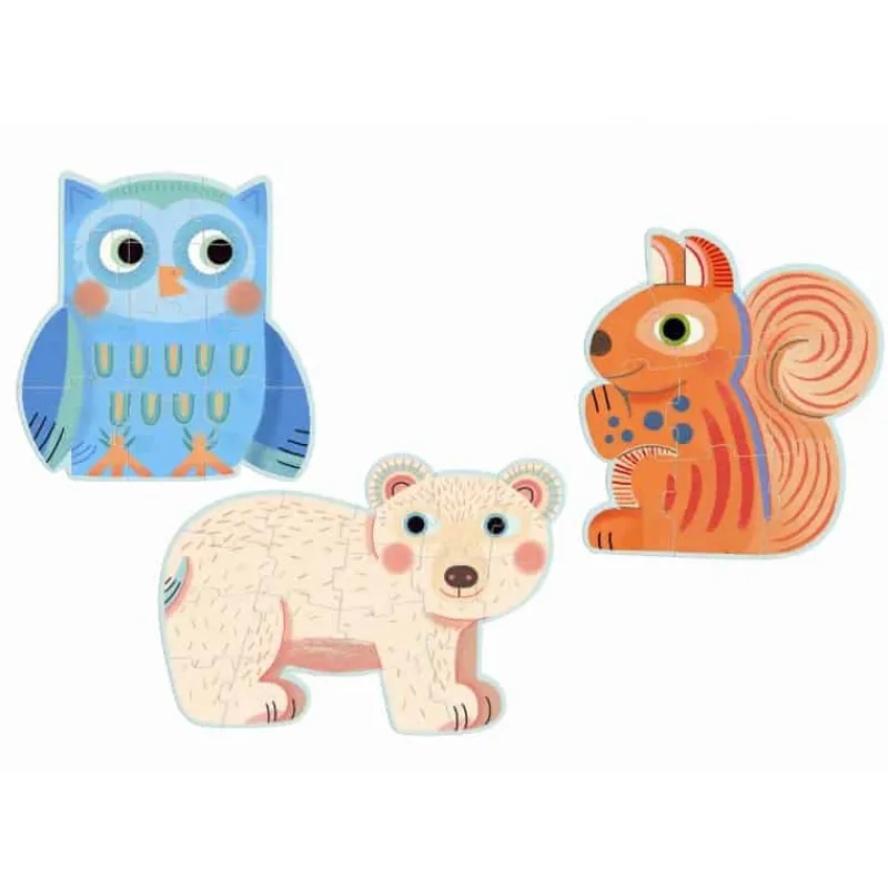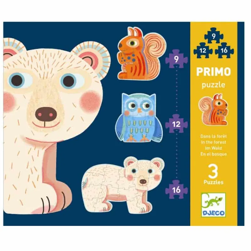 Djeco Primo Puslespil – I skoven, super flot puslespil, der består af 3 forskellige kære puslespil med søde dyremotiver, i forskellige sværhedsgrader. Henholdsvis 9, 12 og 16 brikker.