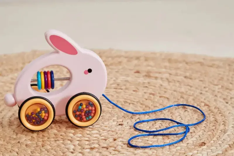 Aktivitets-kanin fra Scandinavian Baby Products. Med denne søde kanin er der fart over feltet! Dit barn kan skubbe kaninen hen ad gulvet eller trække den efter sig. På denne måde motiverer kaninen dit barn til at bevæge sig fremad uanset om din baby møffer sig frem, kravler eller allerede tager sine første skridt. Vores søde kanin har rangle-lyde i alle fire hjul samt aktivitetsruller i kroppen.