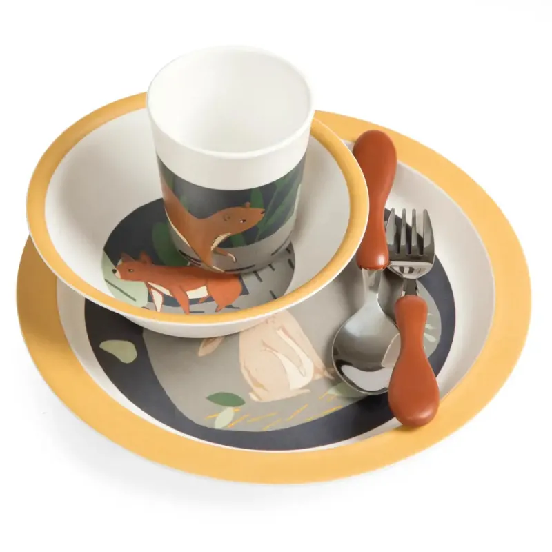 Gavesættet indeholder fem produkter: en flad tallerken, en dyb skål, en kop samt et børnebestiksæt (ske og gaffel).