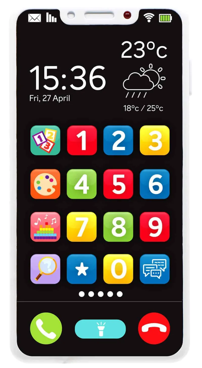 Min første smartphone med lys – ligesom mor og fars! Leg og lær med denne farverige legetøjsmartphone med berøringsskærm. Lær om dyr og lyde, spil klaver eller lyt til glad musik – og vælg mellem lygte og lys, der blinker. Bruger 3 x LR44 knapcellebatterier (medfølger, men kun til demonstration). Fra 24 mdr.