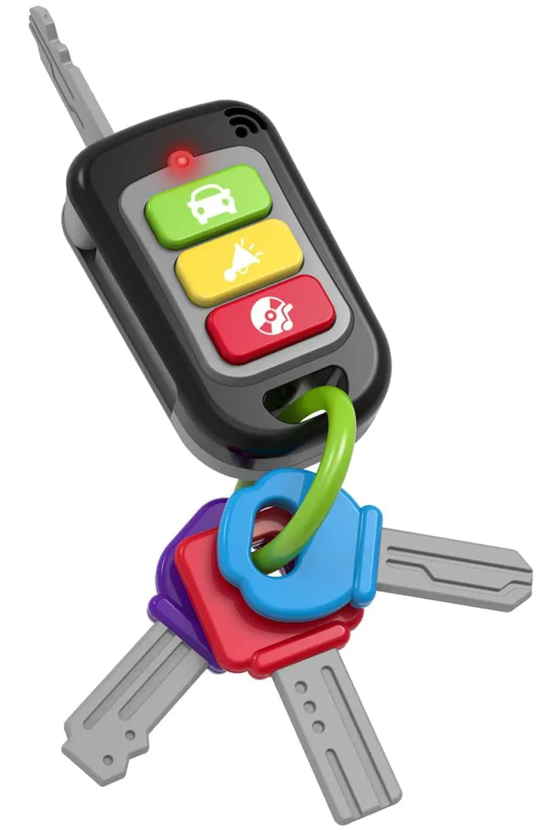 Mine første bilnøgler – ligesom mor og fars! Nøglering med 3 nøgler og en funktionel fjernbetjening til sjovt rollespil. Leg og lær med realistiske billyde og lyseffekter eller lyt til glad musik. Bruger 2 x AAA batterier (medfølger, men kun til demonstration). Fra +24 mdr.